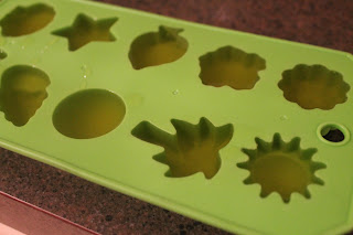 Finally, it is time to pour into molds. You can use an ice cube tray, small soap or candy molds, or even mini muffin cups. Allow the bath melts to cool - you can pop them in the fridge to speed up the process. The first time I made bath melts, the cocoa butter took HOURS to solidify and I was left wondering what I did wrong. That is totally normal - cocoa butter can take a long time to solidify at room temperature.